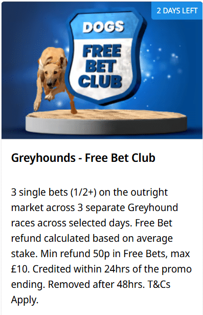 The Free Bet Club rewards regular sports bettors with free bets every week when you place three qualifying bets on Greyhounds markets between Tuesday and Thursday to receive up to £10 in free bets. To qualify, each bet must be at least £10 at minimum odds of Evens (2.00) or higher. Free bets are credited by Friday and must be used within seven days.